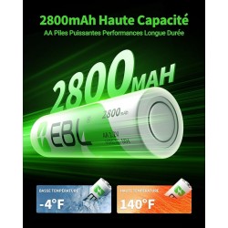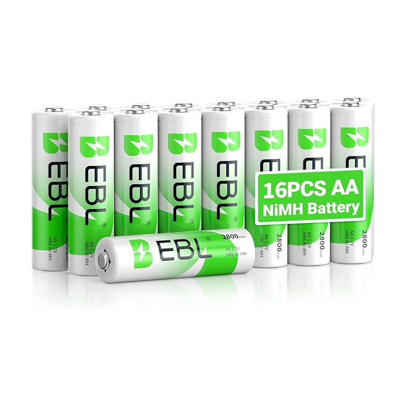 16 PCSAA Piles Rechargeables Plus Haute Capacité:EBL Lot de 16 AA/ HR6 Piles Rechargeables 2800mAh, Le Plus Haute Capacité dans Le Marché que d'Autre Marques Renommées, les AA piles rechargeables peuvent atteindre 2800mAh. Avec deux boîtes de stockages de piles.