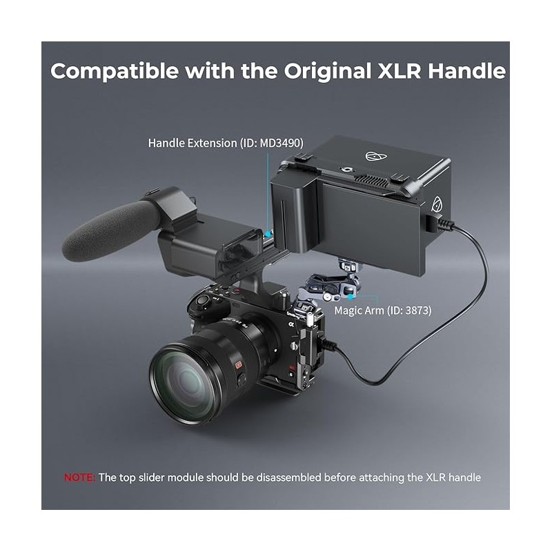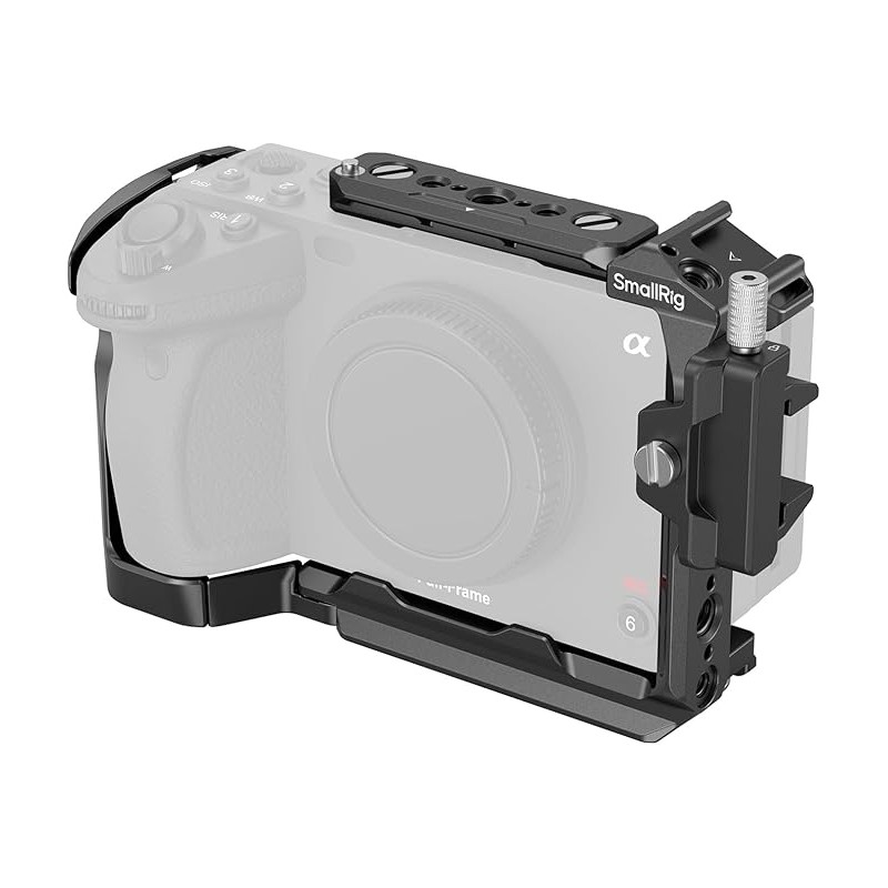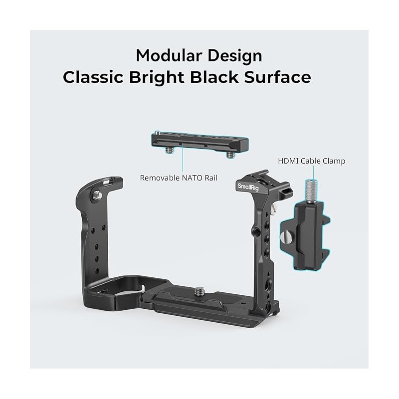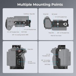 Points de Montage Multiples : L a cage comporte des trous de 1/4"-20 pour le bras magique 3873 ; le trou de positionnement pour ARRI convient à la Poignée Supérieure 3765 ; le rail NATO latéral peut fixer la Poignée Latérale 3813 ; les trous de positionnement 1/4"-20 sur le le coin supérieur gauche et le côté gauche peuvent fixer la Pince à Tige 3598 pour le suivi de la mise au point ; deux trous 1/4"-20 sur le côté peuvent fixer la plaque de dégagement rapide ; le sabot froid intégré peut fixer le Microphone 3468, la Lampe Vidéo LED 3286B.