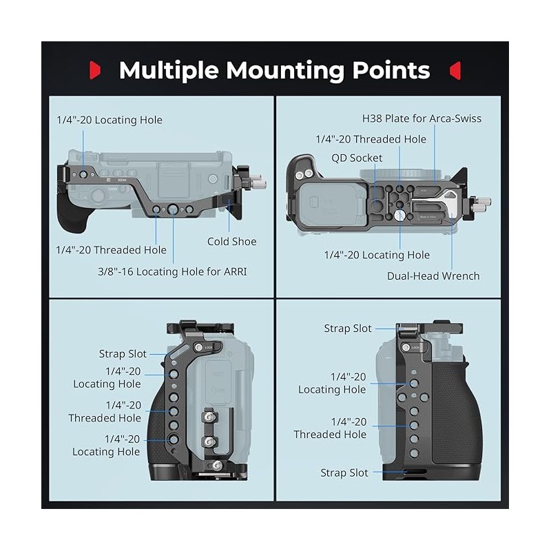 Points de fixation multiples : trous filetés 1/4"-20 intégrés, trous de positionnement 1/4"-20 et trou de positionnement 3/8"-16 pour supports ARRI, QD et griffe porte-accessoires. Poignées latérales et supérieures extensibles, éclairages vidéo, bandoulières, microphones et autres accessoires.