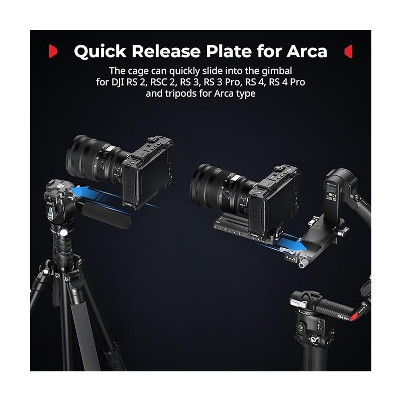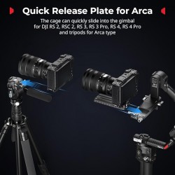 Plaque de dégagement rapide pour Arca-Type : La partie inférieure de la cage intègre une plaque de dégagement rapide pour Arca-Swiss, qui peut être montée directement sur des trépieds pour Arca-Type et pour les cardans DJI RS 2, RSC 2, RS 3, RS 3 Pro, RS 4, RS 4 Pro, permettant des transitions rapides entre les configurations de stabilisateur, de portable et de trépied
