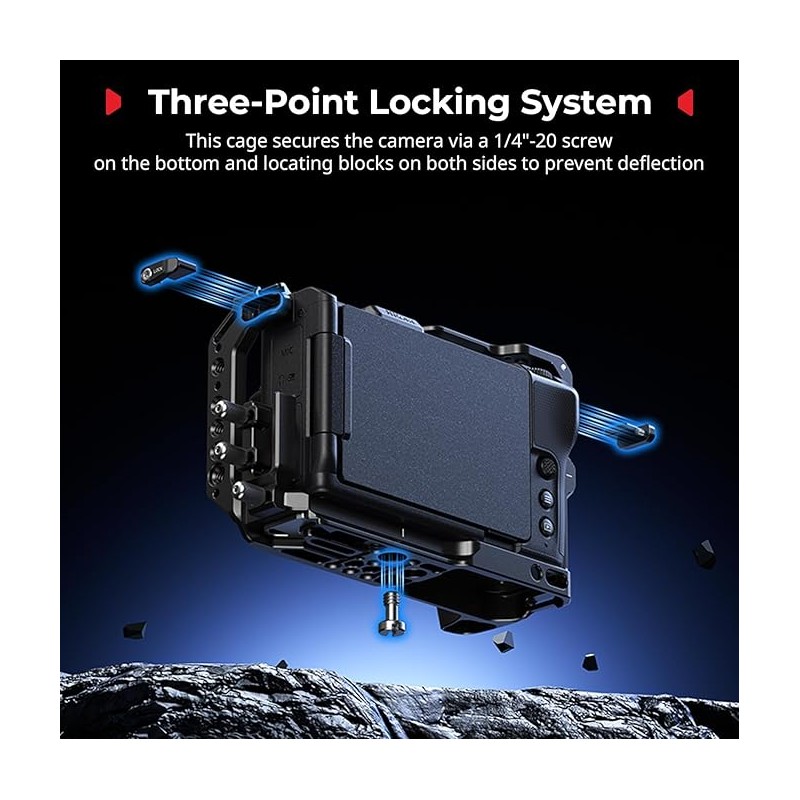 Système de verrouillage à trois points: Doté d'un système de verrouillage à trois points, il se fixe à l'appareil photo à l'aide d'une vis inférieure de 6,35 mm (1/4"-20) et de deux blocs de positionnement latéraux pour une stabilité anti-torsion. Une clé plate magnétique située sous le boîtier facilite le montage et le démontage.