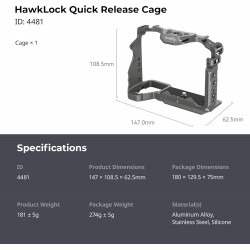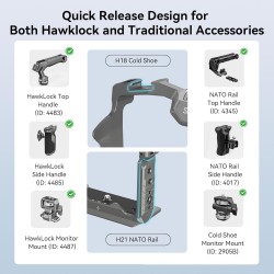 Système de fixation rapide HawkLock breveté et développé en interne : verrouillage automatique stable par simple pression d’un bouton, glissement fluide et montage/démontage facilité. La cage à fixation rapide est également compatible avec les systèmes de fixation traditionnels (griffe porte-accessoires), les rails NATO et les accessoires Arca.