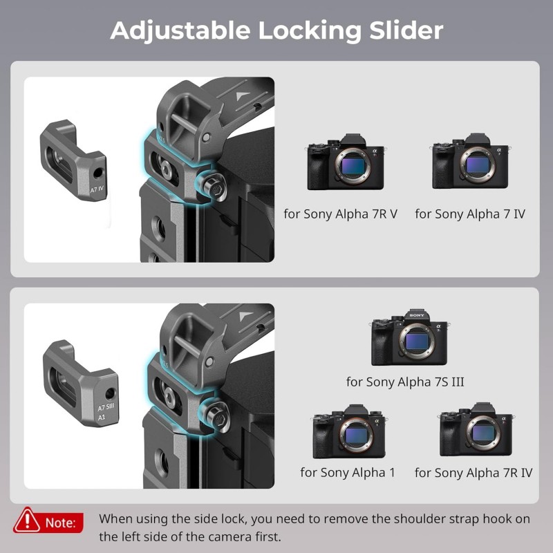 Verrouillage en trois points :la caméra est verrouillée par la goupille de positionnement inférieure, la vis 1/4"-20 et la vis M2.5 gauche, assurant une fixation stable et sans jeu. Le sens de la glissière de verrouillage gauche est réglable pour s'adapter à différents modèles. Le côté avec le logo [A7 IV] est compatible avec les Alpha 7 IV et Alpha 7R V, et le côté avec le logo [A7S III] avec les Alpha 7S III, Alpha 1 et Alpha 7R IV. Le dessous de la cage intègre une clé magnétique pour un montage et un démontage faciles.