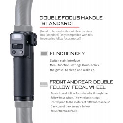 La poignée de droite permet de contrôler les mouvements de la nacelle. Des ports de contrôle sont présents pour la caméra. La molette permet de contrôler le moteur focus DJI ou Tilta Nucleus M ou Nano (vendu séparément). La poignée gauche comprend deux molettes qui peuvent également être utilisées pour contrôler le moteur focus.