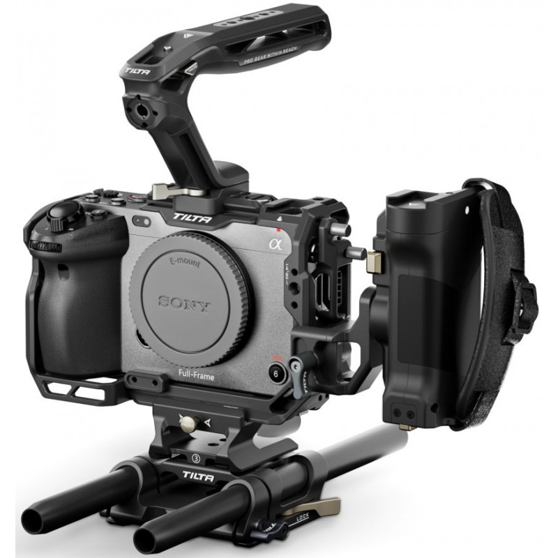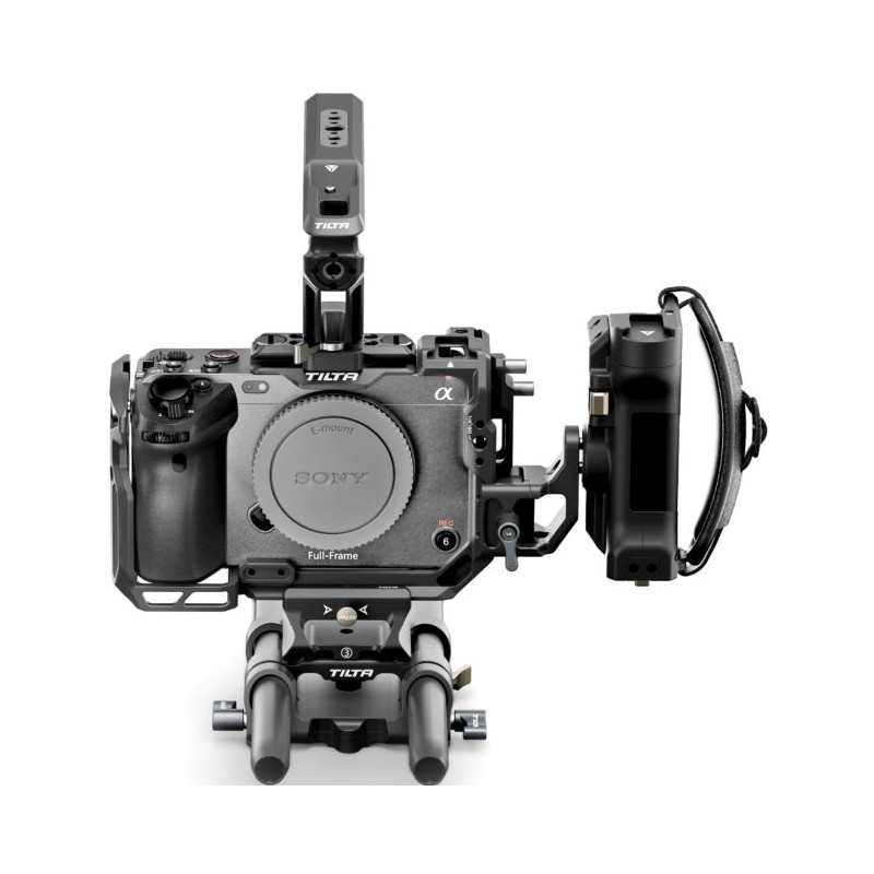 - Poignée latérale : la poignée d'alimentation avancée se connecte à la cage via le rail OTAN et alimente les accessoires ainsi que prend en charge le contrôle de l'arrêt via le câble inclus. La rotation réglable et la dragonne supplémentaire offrent un confort et une flexibilité exceptionnels lors de l'utilisation du Sony FX3 et FX30.