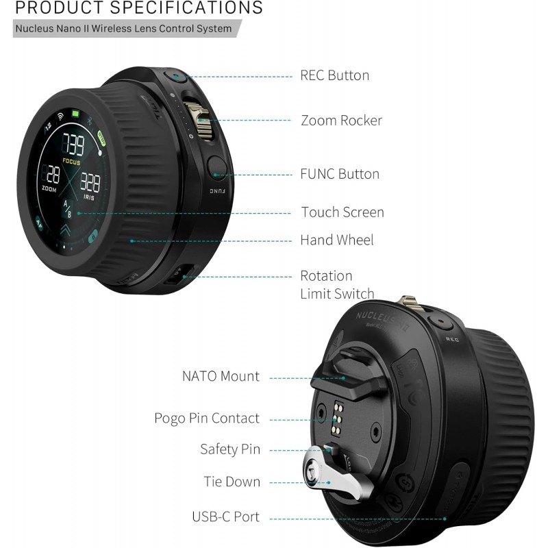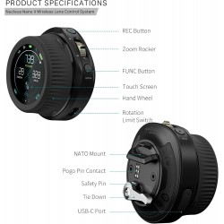 COMMUNICATION AVEC LA CAMÉRA: Le Nano II permet aux utilisateurs d'ajuster sans fil les paramètres de l'appareil photo tels que ISO, vitesse d'obturation et fréquence d'images via Wifi, Bluetooth et le port USB-C du moteur pour les systèmes d'appareils photo compatibles tels que Canon, Sony, Black Magic Design et plus encore.