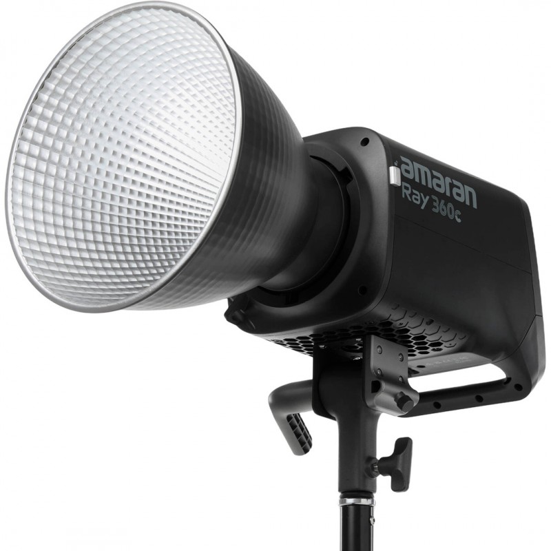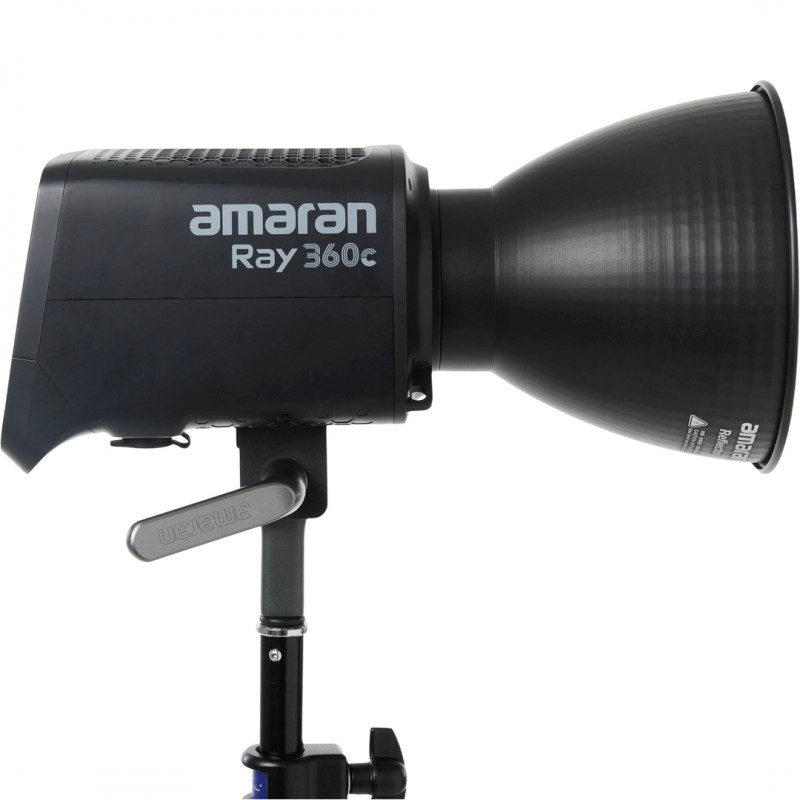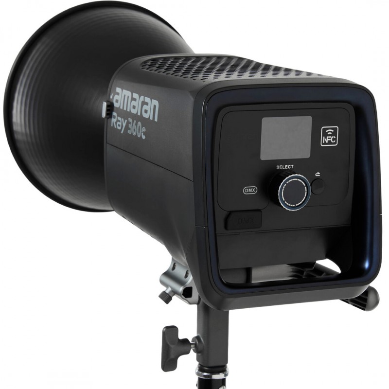 Le amaran Ray 360c intègre un support inclinable métallique avec récepteur Baby Pin 5/8, facilitant les montages sur stands professionnels. Il inclut également un support de sécurité pour chaîne, ainsi qu’un porte-parapluie pour les setups utilisant des diffusions sur parapluies. Son écran simplifié en couleurs, associé au FlowTurn knob, permet une navigation rapide, un réglage intuitif et un accès direct aux modes rapides ou personnalisés.